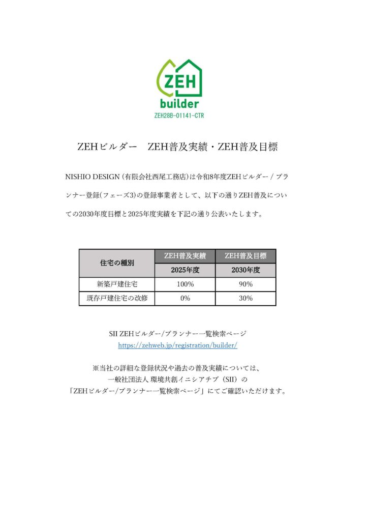 政府が定める「住宅について、2020年までに標準的な新築住宅で、2030年までに新築住宅の平均で住宅の年間の一次エネルギー消費量が正味(ネット)でゼロとなる住宅=『ZEH』の実現を目指す」という政策目標に対して、NISHIO DESIGNは下記の目標値を設定し「ZEH」の努めております。